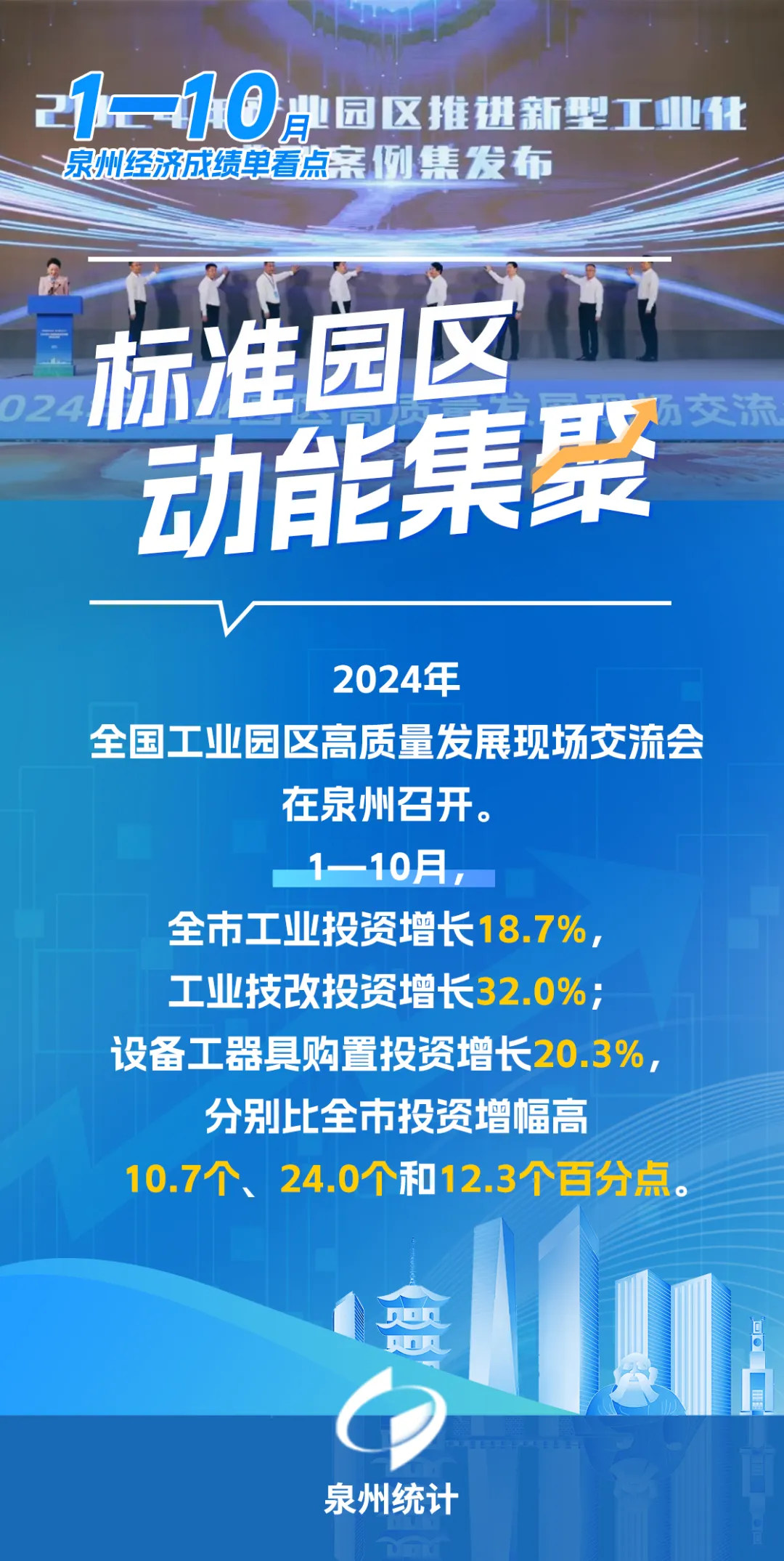 一是标准园区动能集聚。2024年全国工业园区高质量发展现场交流会在泉州召开。1—10月,全市工业投资增长18.7%,工业技改投资增长32.0%,设备工器具购置投资增长20.3%,分别比全市投资增幅高10.7个、24.0个和12.3个百分点。