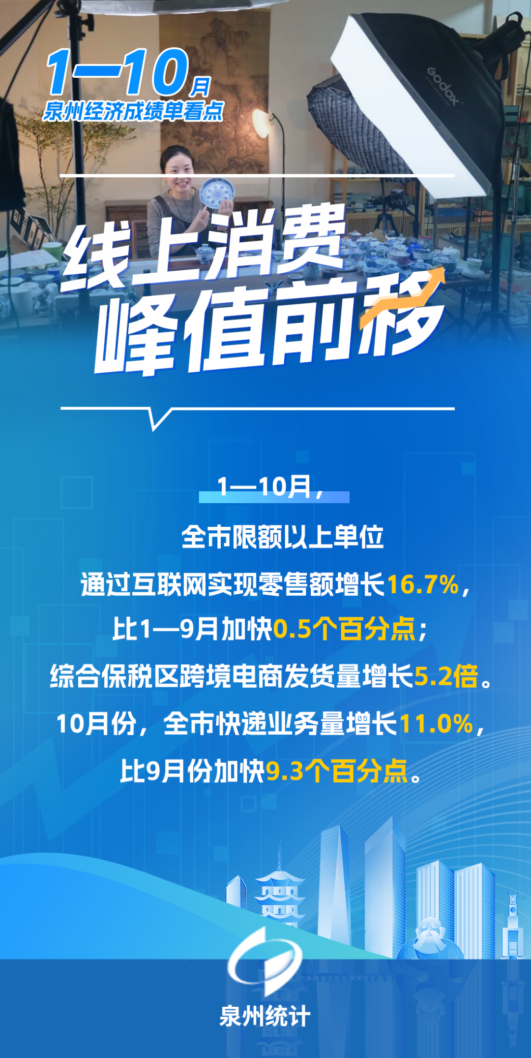 一是线上消费提前升温。1—10月,全市限额以上单位通过互联网实现零售额增长16.7%,比1—9月加快0.5个百分点。10月份,全市快递业务量增长11.0%,比9月份加快9.3个百分点。