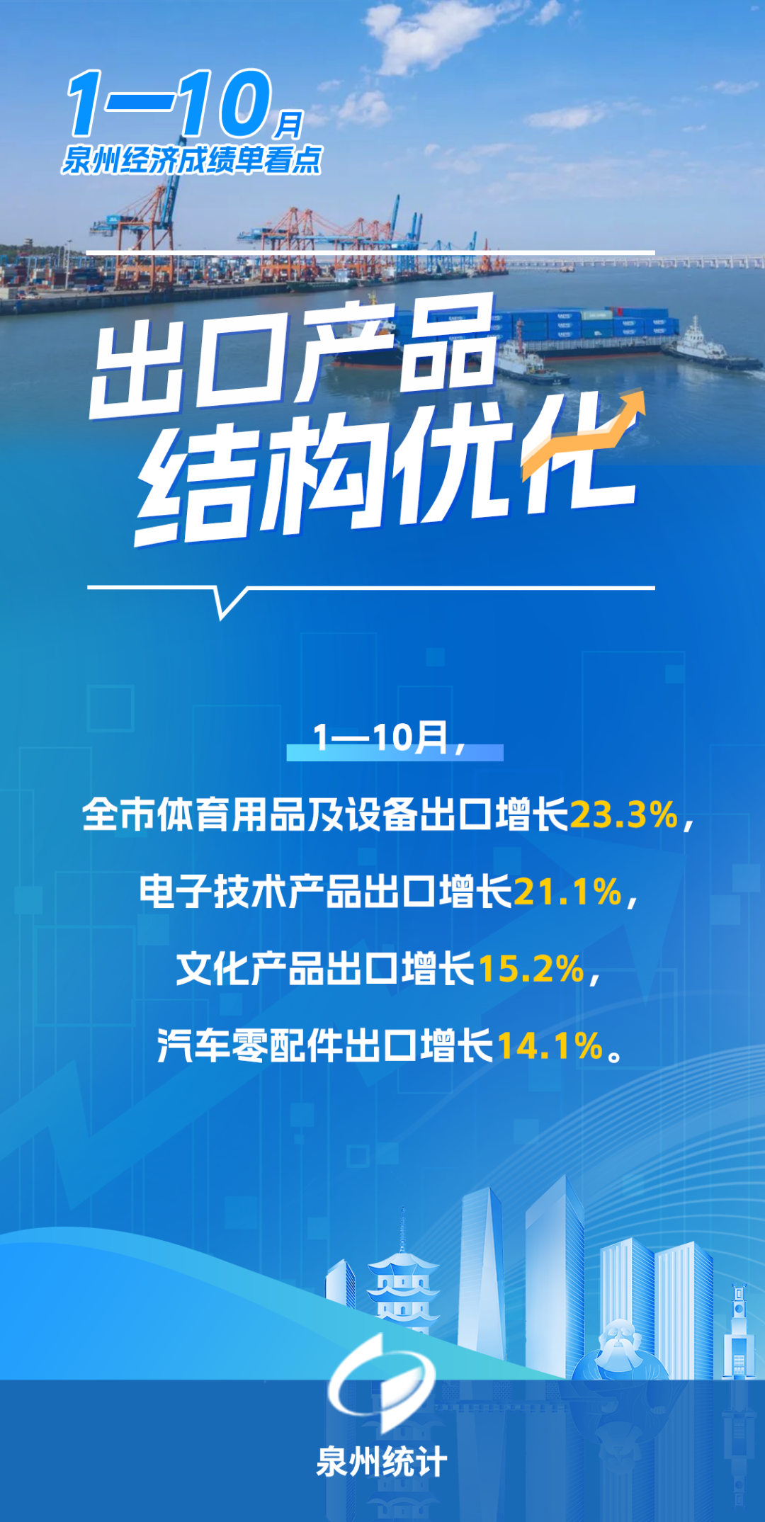 今年以来,泉州坚持稳中求进工作总基调,完整、准确、全面贯彻新发展理念,深化拓展“深学争优、敢为争先、实干争效”行动,坚持“稳一优二强三”战略思维,新质生产力加快形成,高质量发展扎实推进。1—10月,全市经济运行总体平稳、稳中提质。