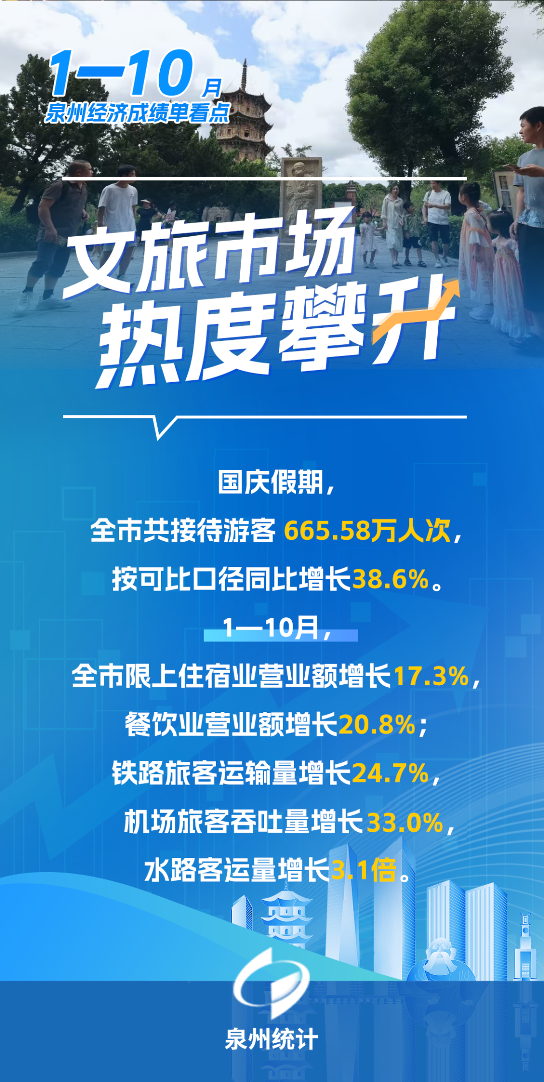 四是文旅消费潜力释放。古城游、滨海游持续火热,国庆假期,全市共接待游客 665.58万人次,按可比口径同比增长38.6%,游客旅游总花费58.12亿元,按可比口径同比增长35.1%,接待游客人次、旅游总花费均创历史同期新高。1—10月,全市限上住宿业营业额增长17.3%,餐饮业营业额增长20.8%;铁路旅客运输量增长24.7%,机场旅客吞吐量增长33.0%,水路客运量增长3.1倍。